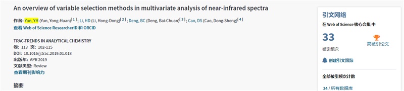该篇论文题“An overview of variable selection methods in multivariate analysis of near-infrared spectra”,于2019年4月在JCR一区分析化学top期刊《TrAC Trends in Analytical Chemistry》(2020影响因子为9.801)正式发表(https://www.sciencedirect.com/science/article/pii/S0165993618304709)。此篇论文得到国家自然科学基金(21705162)及海南大学高层次人才引进科研启动项目(KYQD(ZR)-1844)的资助,这是beat365以第一单位发表的第三篇ESI高被引论文,充分证明beat365科研实力的不断提升。