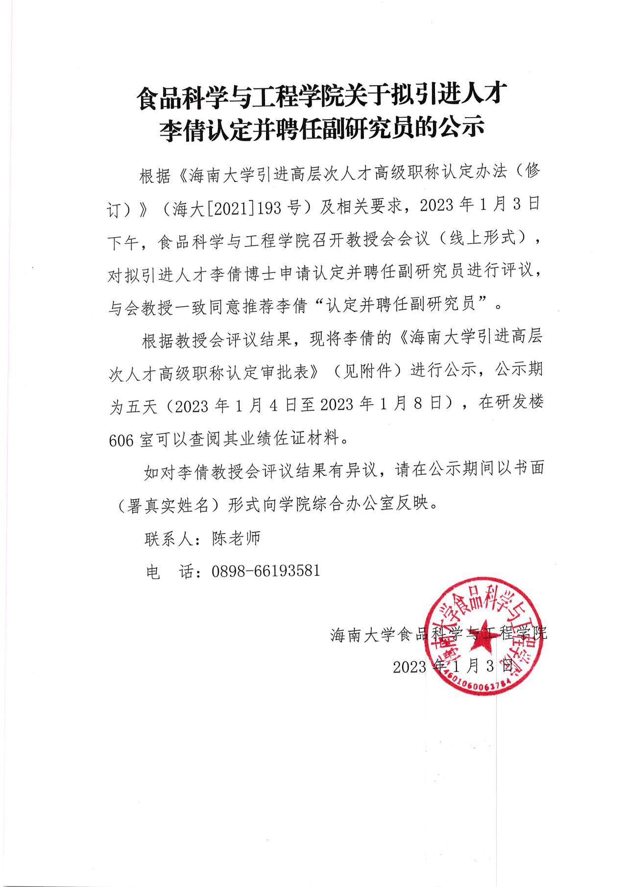 beat365中国唯一官网关于拟引进人才李倩认定并聘副研究员公示